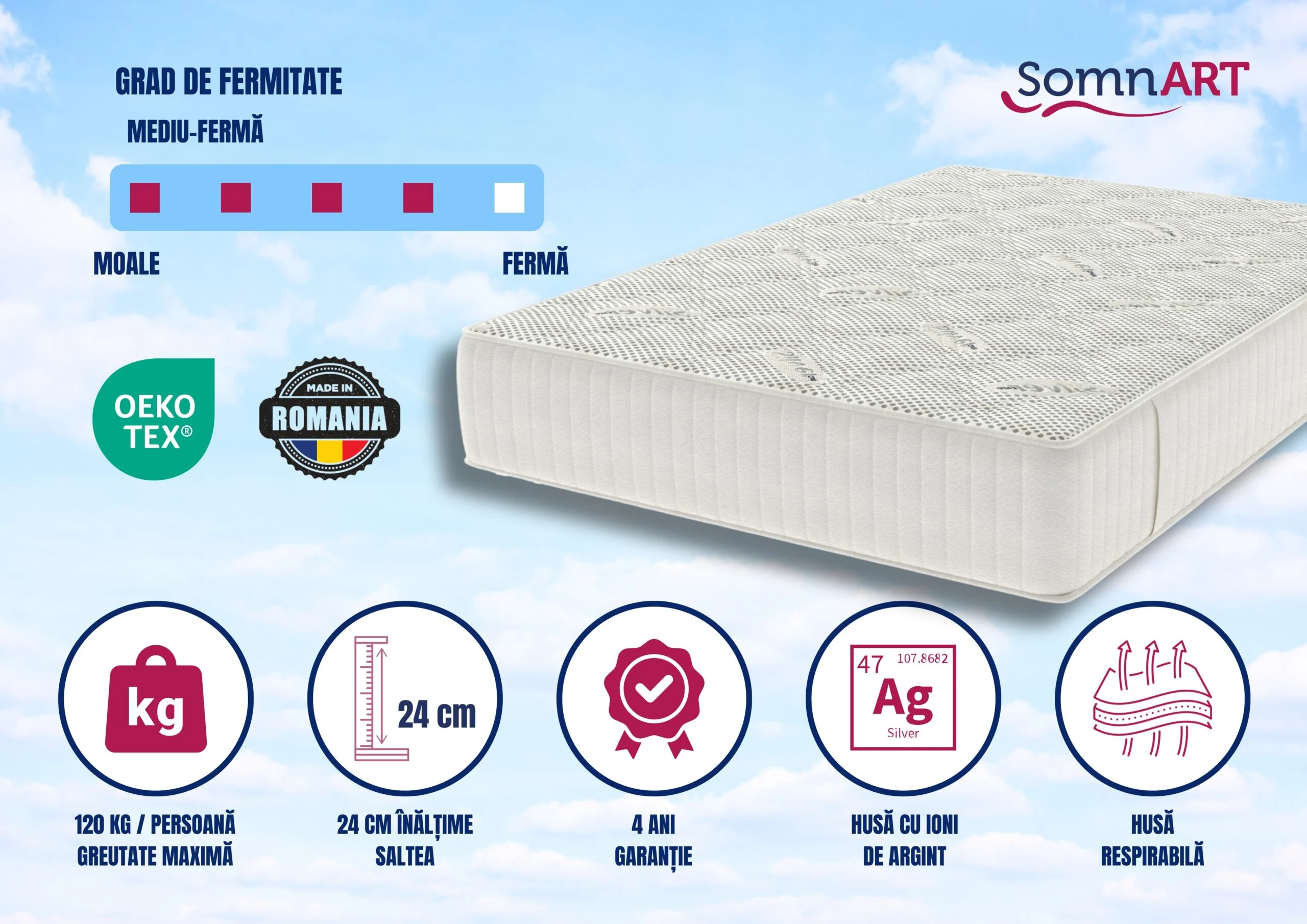 • Certificare Oeko-Tex Standard 100: Garantează absența substanțelor nocive, oferind siguranță și confort, de la materia primă la produsul finit.