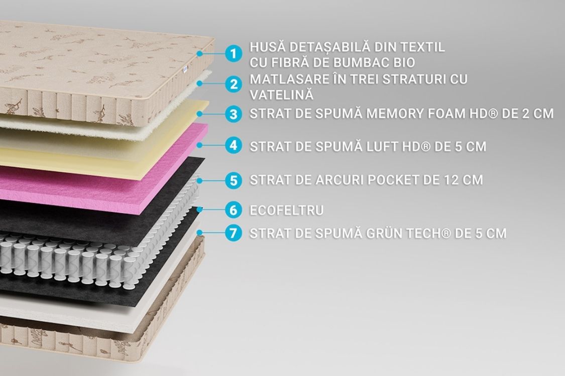 • Structură stratificată: Grün Tech® (5 cm) + Pocket Spring (12 cm) + Luft HD® (5 cm) + Memory HD® (2 cm) – combinație de susținere, ventilație și confort.
